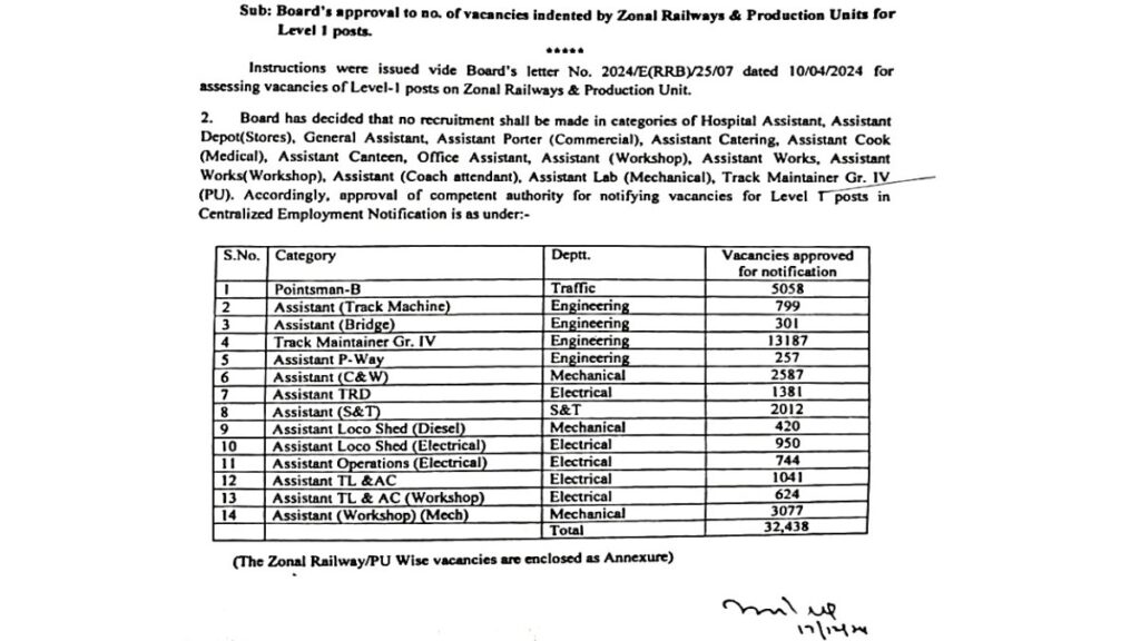 रेलवे की ग्रुप डी भर्ती को लेकर एक बार फिर सोशल मीडिया पर बड़ी खबर तेजी से वायरल हो रही है। वायरल हो रहे नोटिस में दावा किया जा रहा है कि रेलवे में ग्रुप डी (लेवल-1) के 62,460 पर नई भर्ती जारी की जा रही है। इस नोटिस में आयु सीमा, मेडिकल मानक और कुल की संख्या तक की जानकारी दी गई है। हालाँकि, असलियत में यह है कि रेलवे भर्ती बोर्ड (आरआरबी) की ओर से अभी तक ऐसी किसी भी भर्ती को लेकर कोई आधिकारिक घोषणा नहीं की गई है। वृषभ को आधिकारिक तौर पर केवल वेबसाइट पर जारी सूचना पर ही भरोसा करना चाहिए।